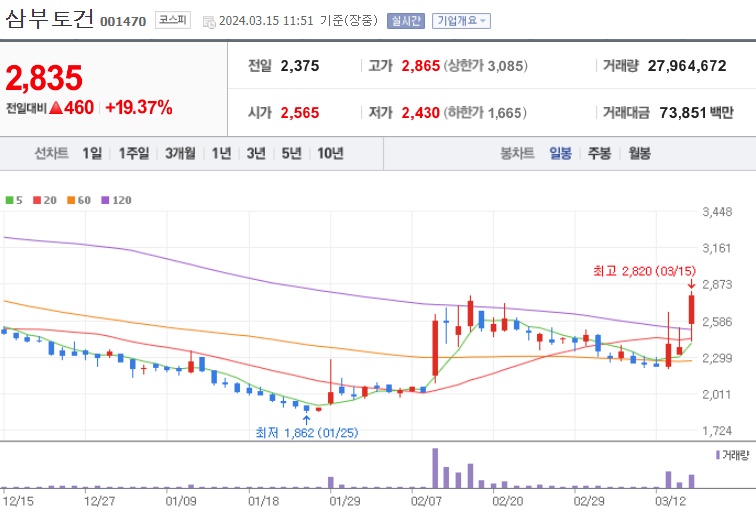 2024년 3월 15일 기준으로 삼부토건의 주가는 2,835원으로, 전일 대비 460원(19.37%) 상승중 입니다.