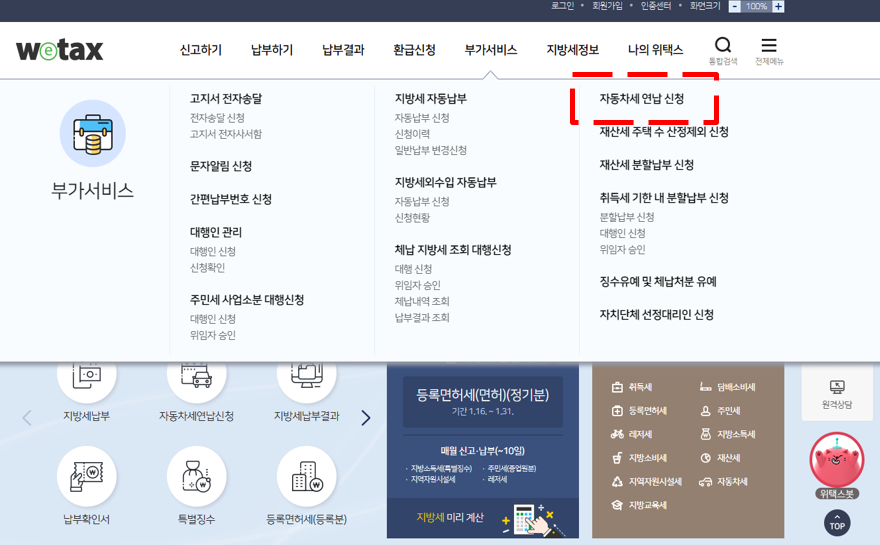 ③ 부가서비스 카테고리 에서 자동차세 연납 신청 클릭