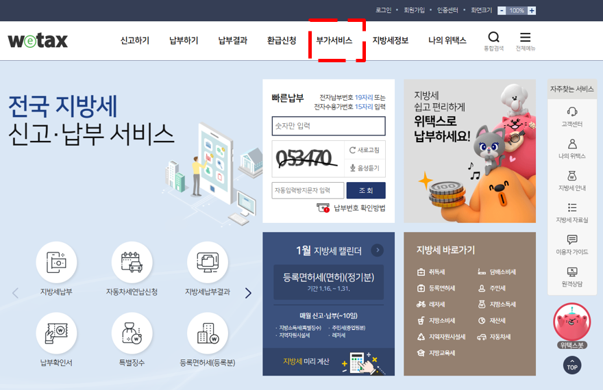 ② 위택스 홈페이지 접속 후 부가서비스 카테고리 클릭